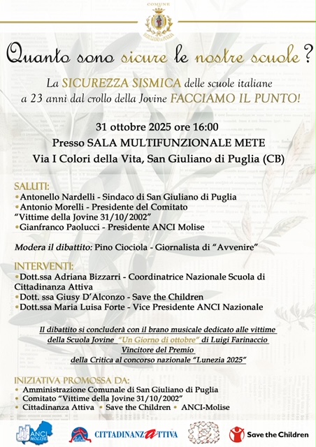 Quanto sono sicure le nostre scuole? LA SICUREZZA SISMICA delle scuole italiane a 23 anni dal crollo della Jovine FACCIAMO IL PUNTO! “Insieme per il bene comune”, dal 12 al 14 novembre a Bologna la 42esima Assemblea annuale Anci